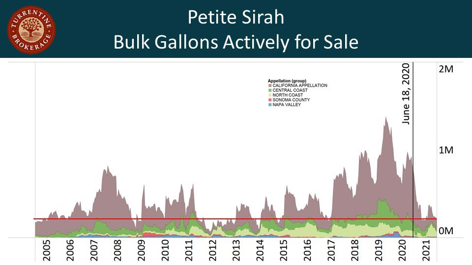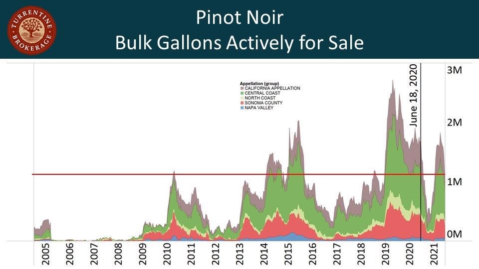 Even though the volume of bulk wine actively for sale might be down, the number of lots for sale and the number of sellers with wine on the market are higher. These are indicators of clients concerned about future sales or an excess market. While markets overall have been active, there are varieties from regions where the volume of bulk wine for sale is in excess of current demand. This presents opportunities for buyers and should caution sellers on their price expectations. In some cases, sellers are confident in their assessment of the market and are willing to carry wine through harvest rather than come down to buyers’ offerings. Some of these wines highlighting the gap in expectations between buyers and sellers are 2019 and 2020 Central Coast Pinot Noir and Chardonnay, 2019 and 2020 North Coast Cabernet Sauvignon and red blenders, and 2020 Sonoma County Pinot Noir (excluding Russian River Valley). As a broker, our job is to match buyers and sellers, share information to raise awareness, and facilitate the market. Despite being presented with the aforementioned opportunities, buyers generally remain unmotivated to buy these items at the moment.