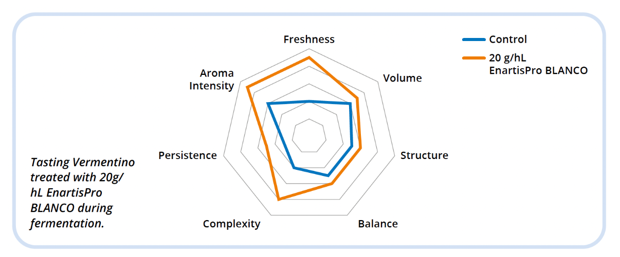 - EnartisPro BLANCO is a yeast derivative rich in readily soluble mannoproteins. Addition during pre-fermentation and fermentation releases sulfur amino acids that protect aromatic compounds from oxidation, thus, resulting in wines with a younger, more intense, and fresher color tone.