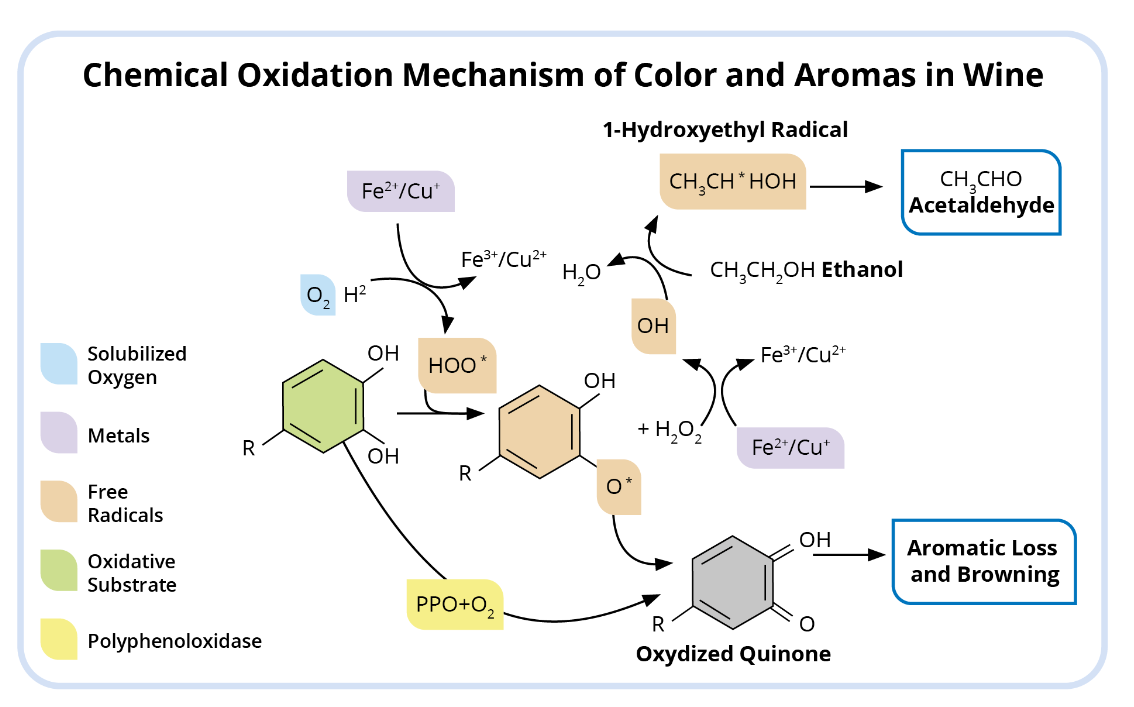 Chemical oxidation: The presence of O2, with metals such as iron and copper, can lead to the appearance of free radicals capable of oxidizing ethyl alcohol to acetaldehyde leading to oxidized aromas. In addition, free radicals are capable of rapidly oxidizing SO2 and thiols, leading to a disappearance of the aromatic forms, resulting in a loss of aromatic freshness.