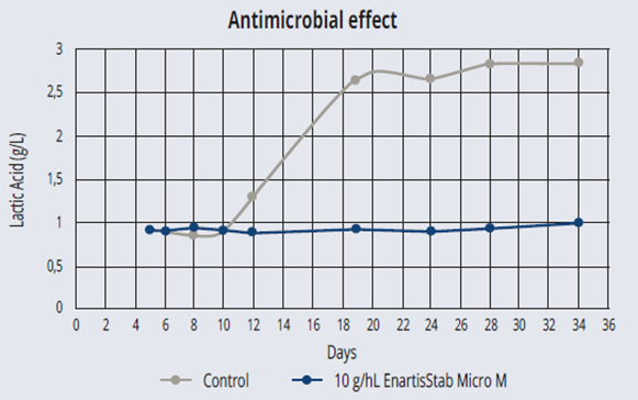 EnartisStab Micro M is an antimicrobial fining agent that can be used at any stage during the winemaking process to control spoilage microorganisms. In addition to being allergen-free and vegan-friendly, these bioregulators’ antimicrobial activity is not influenced by wine or juice pH (Figure 1). Activated chitosan can be used to control non-Saccharomyces yeast, bacteria, and molds (including Botrytis cinerea). Furthermore, it can limit oxidation reactions by chelating metals such as copper and iron, which are catalysts of enzymatic and non-enzymatic oxidation reactions. It works on contact and does not remain in the wine.