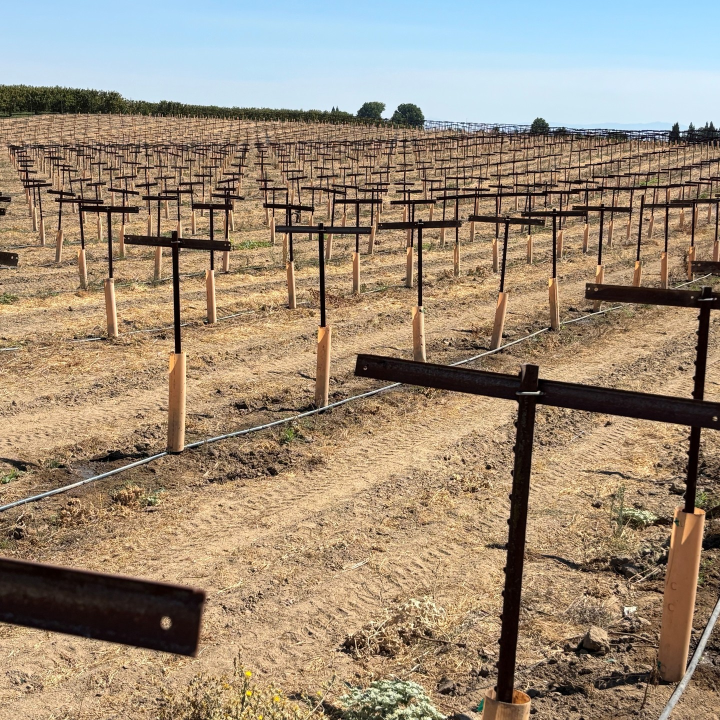 A late-season bare root planting in the Lodi foothill region from mid-August. Prior to planting, these vines underwent a 14-day acclimation period. While we typically advise against planting beyond June, this vineyard faced unavoidable delays due to county-imposed burning restrictions, unfortunately postponing their planting schedule by several months. We are pleased to witness the vines have been successfully planted and are thriving in their new environment.