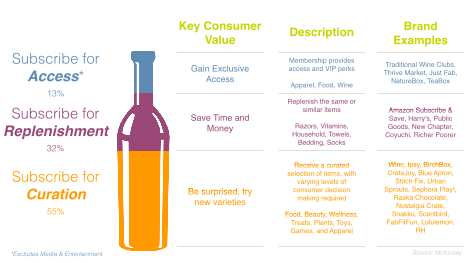 A McKinsey Report lays out the current state of subscription models very clearly. What jumps out is that the traditional model of Subscribe for Access has been usurped by the newer models of Subscribe for Replenishment and Subscribe for Curation. And, while Subscribe for Replenishment accounts for a healthy one-third of subscriptions, it is not a relevant category for wine clubs, given its focus on essential household, wellness, and grooming products. This leaves the wine industry needing to evolve the traditional wine club model beyond offering a choice here or there to compete within Subscribe for Curation.