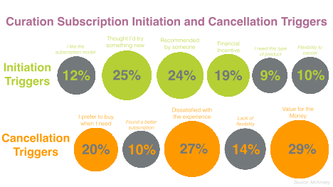The initiation triggers point to consumers’ desire to discover new things and especially new things someone else recommends. A strong social media presence and refer-a-friend incentives are critical to this discovery process. Cancellation triggers hinge on the experience – either the overall experience or the perceived value for money vis-à-vis the experience. Given the need to elongate subscription lifetime values, every step of the experience offered needs to be executed at the highest level. Consumers not only expect it, but they also know what a great experience feels like. After all, the average consumer now has between 3 and 10 subscriptions (excluding media and entertainment.