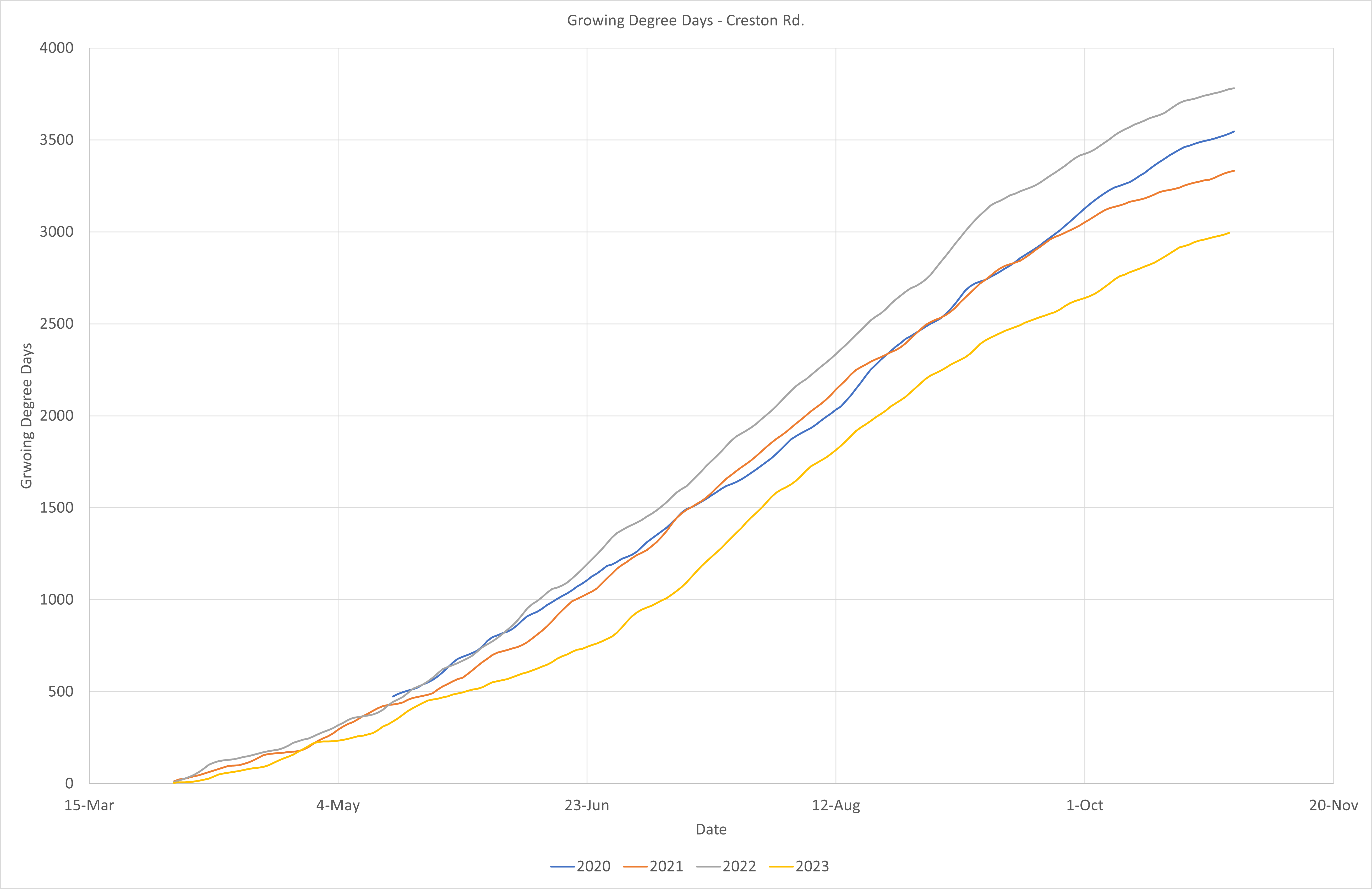 I wrote about how 2023 was shaping up back in July when I looked at how Growing Degree Days (GDD) were stacking up compared to other years. GDDs are typically calculated by taking the average of the daily minimum and maximum temperature and subtracting a base number, in this case 10°C (50°F). Back in July, most places sampled were around 300 GDDs behind previous years. After rerunning the temperature data this week, it looks like the season never caught up.