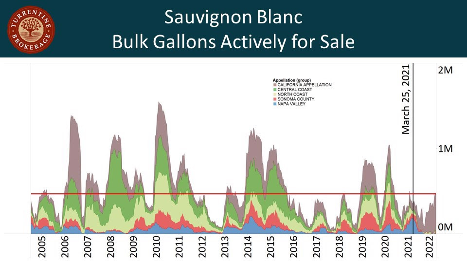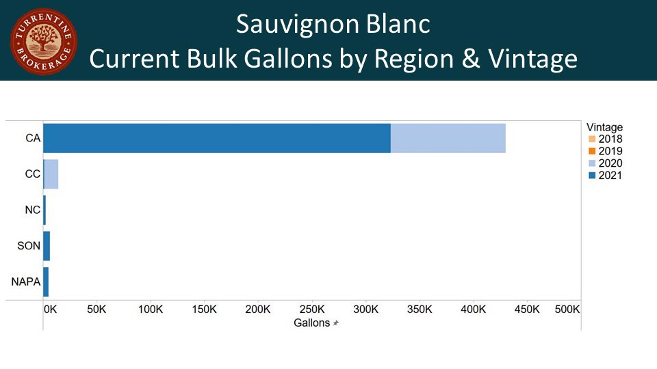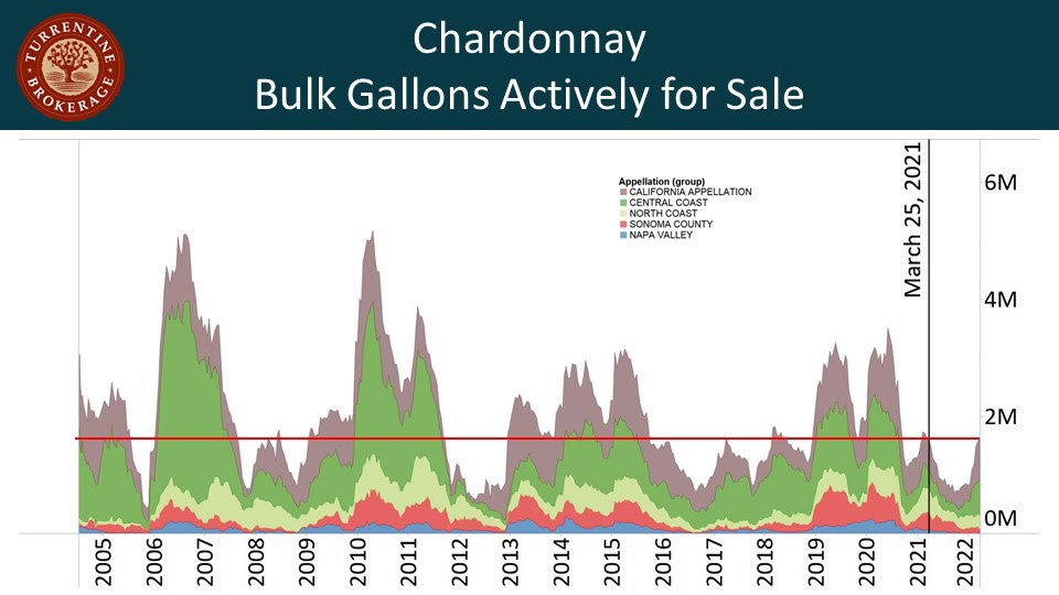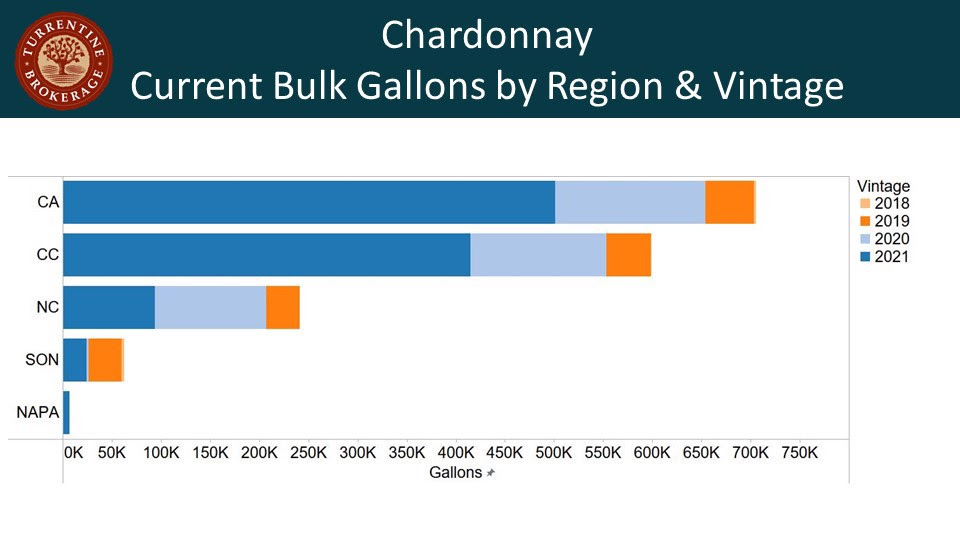 - There are 1 million gallons available of 2021 vintage Chardonnay, with more than 600,000 gallons of 2020 vintage and older vintages still on the market.