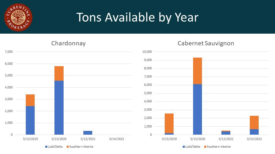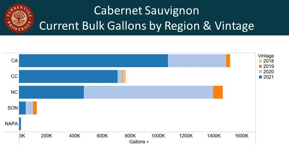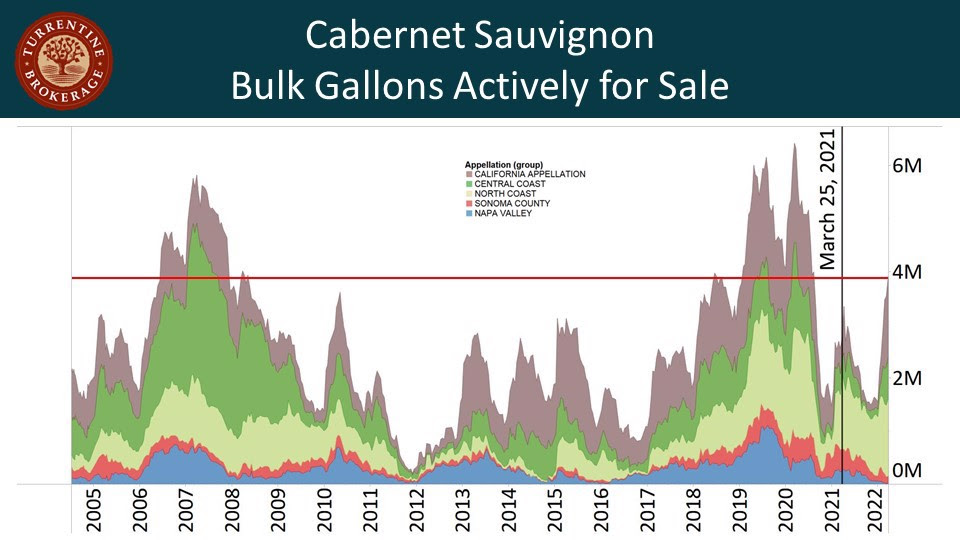 - Total Cabernet Sauvignon bulk supply actively for sale is currently above last year, but still down significantly from the same time in 2019 and 2020.