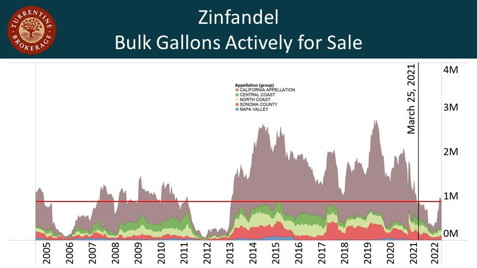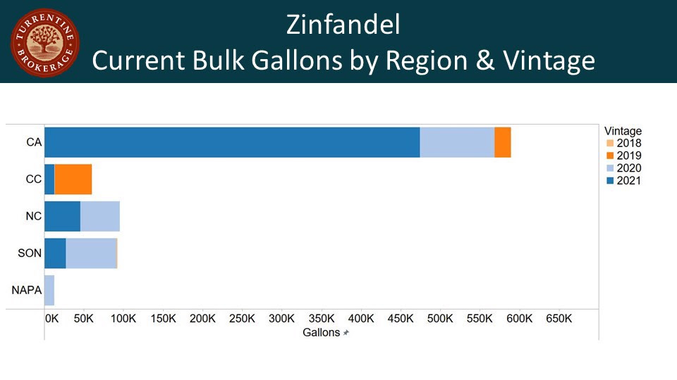 - The available supply of Zinfandel in bulk is still heavily weighted towards California Appellation, but the volumes listed are a fraction of what they were from 2014 through 2020.