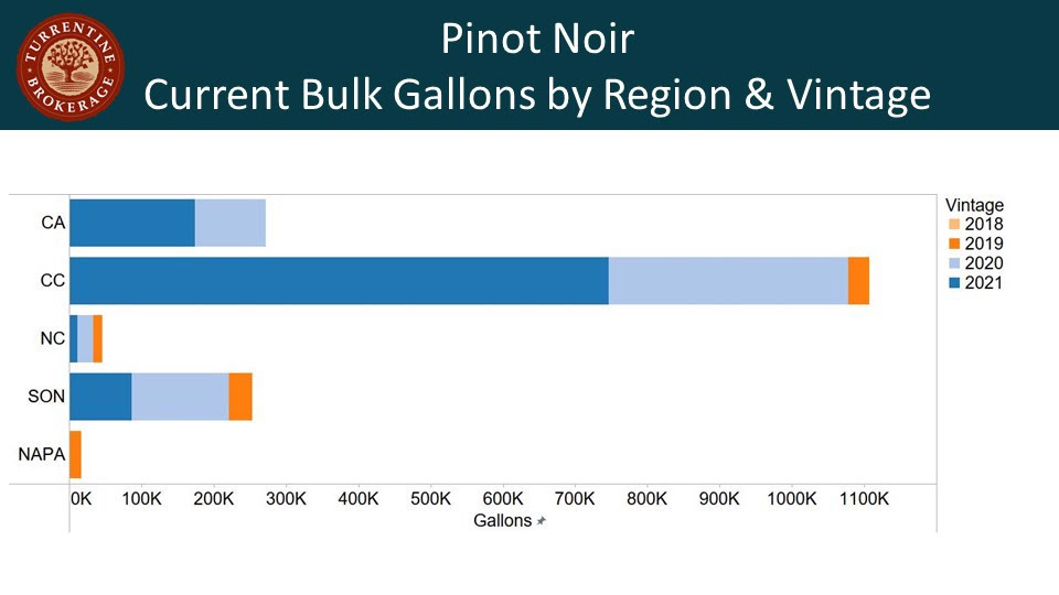 - The majority of Pinot Noir gallons available are from the Central Coast—a region that continues to be in more of an excess position than others.