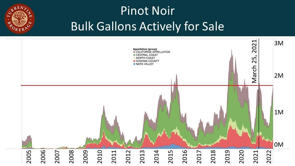 - Total Pinot Noir gallons are similar to last year, both in total gallons available and by region; but gallons available are lower than in mid-March of 2019 and 2020.