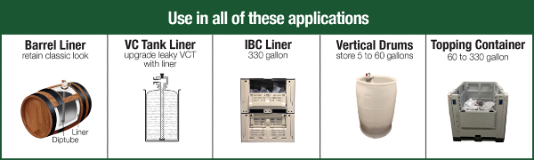SmartBarrel liners are available in 60 gallon vertical and horizontal drum formats. Any user-supplied drum/barrel can be used to hold the liner. GOfermentor even offers kits to convert old wood barrels to SmartBarrels. 330-gallon liners are provided for use in user-supplied IBC/macrobins. Liners are single-use, so there is no cleaning. A perfectly clean storage container is instantly available.