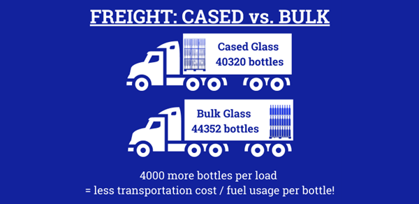 Opting for bulk glass reduces carbon emissions by eliminating a production step and double-handling. Additionally, a fully loaded freight truck carrying bulk glass can transport 10% more glass per trip than cased ware. This increased load capacity maximizes fuel efficiency, especially with advanced freight planning, production management, and sourcing from local providers. Bulk ware also requires less corrugated outer packaging, reducing waste, emissions and raw material consumption.