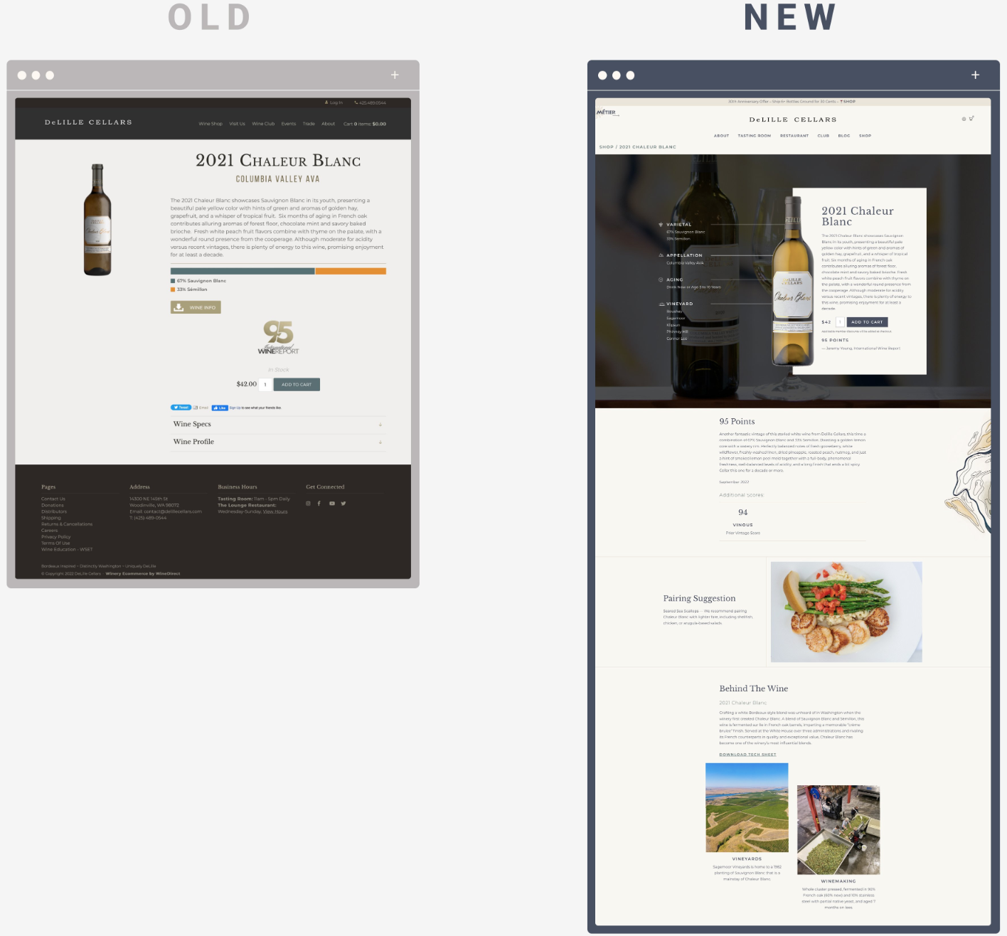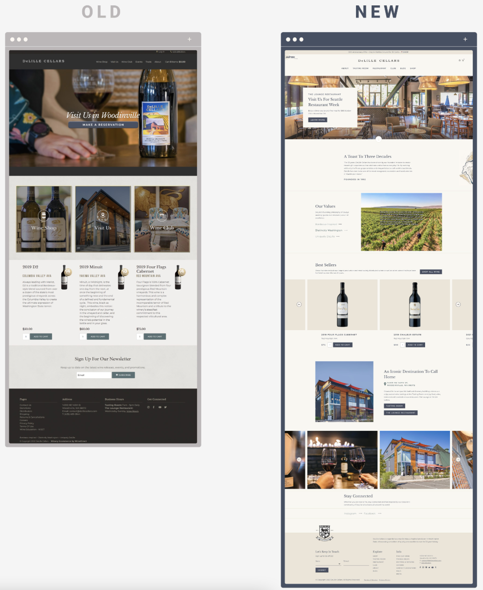 Their old homepage showed what DeLille Cellars was, but didn’t explain the “why” behind the brand. Too many winery websites make the same mistake of having a simple hero image and then three boxes with links to other pages. Consumers today expect more from a homepage. They are hungry for a storytelling component and what to know what a brand stands for.