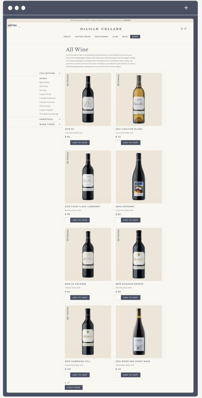 The new shop for DeLille Cellar’s website is clean and inviting. Right away users are greeted with bottles of wine above the fold. We move the sub-navigation to the left side of the page where customers expect to find it. We broke up the options into major categories so users can easily navigate to find the wine they are looking for. User experience research studies prove that when users can find the product they are looking for faster through categories or filtering, they are more likely to convert.