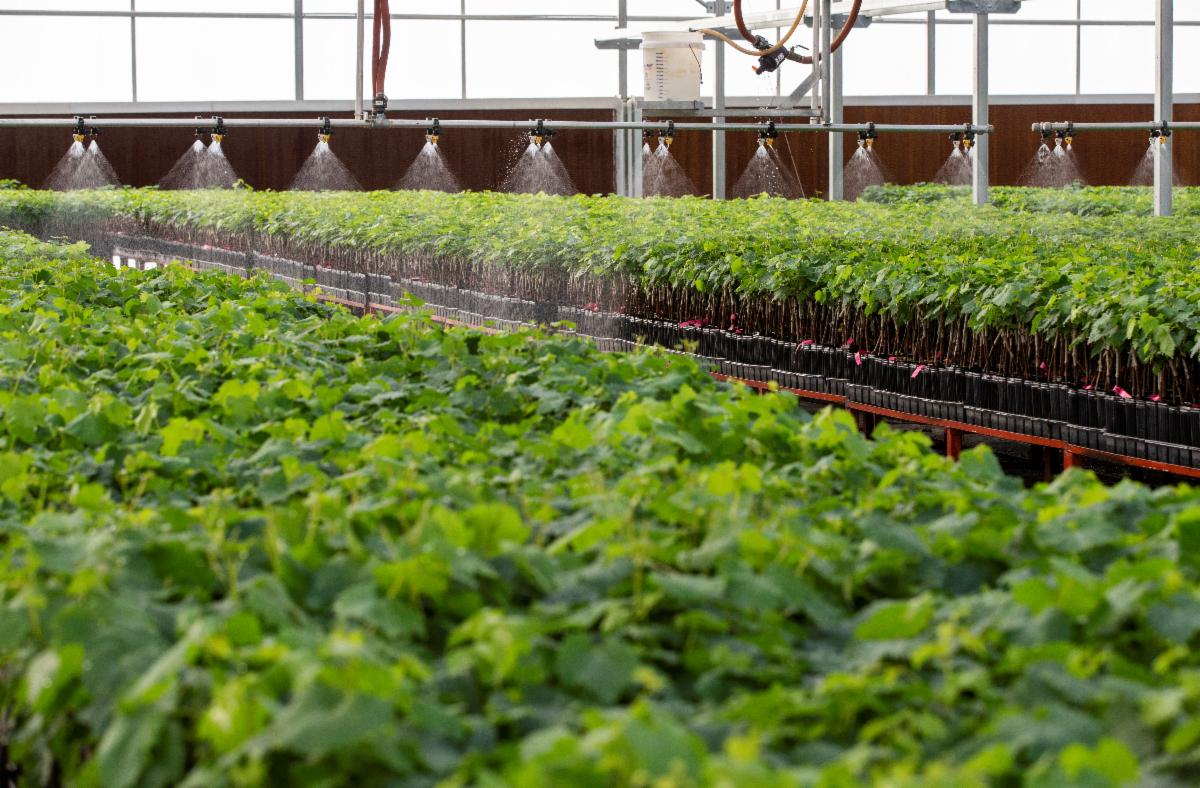In order to ensure the highest level of quality and vine cleanliness in the business, Sunridge is proud to share a new groundbreaking concept we have implemented this year with our custom-built water fertigation system. As of today, we are the first and only grapevine nursery in North America to utilize such a technique, the most advanced fertigation and water treatment system currently in the U.S. The innovative system produces a custom PHA (Pure Hypochlorous Acid) disinfectant, to ensure the irrigation water is kept clean from harmful bacteria, fungal, or viral pathogens while simultaneously oxygenating the root systems for our potted vines. In addition, our customized fertilizer blend allows us to adequately enrich the plants ensuring essential nutrients for optimal plant health are provided. The fertigation system has a storage capacity of over 100,000 gallons and can provide irrigation to 18 greenhouse bays, or 900,000 vines, simultaneously. This investment in the most advanced greenhouse horticultural technology continues to allow Sunridge to be the industry leader in grapevine propagation.