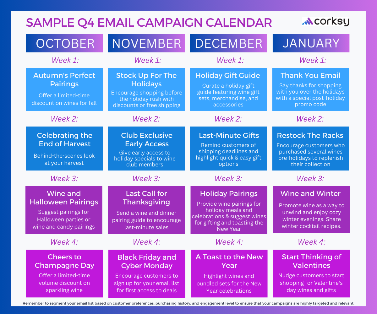Define your Q4 objectives, whether it’s increasing revenue, growing your wine club, or driving eCommerce sales. Set measurable goals and track your progress regularly.
