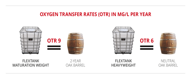 Almost every Flextank comes in your choice of Maturation Weight (2-year barrel) or Heavyweight (neutral barrel) and are superior to stainless steel, concrete tanks, and especially IBCs in that they naturally integrate oxygen into the wine at the same rate as the average barrel. Click here to view an independant study on Flextank vs. a 2-Year Oak Barrel.