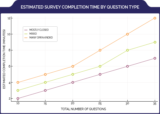 Respondents can typically answer 3 to 5 questions per minute, depending on complexity. Aim to keep your survey under 5 minutes, which translates to approximately 15 to 25 questions in total. Surveys that exceed 10 minutes often see significant drop-off rates, particularly when taken on mobile devices. To improve completion rates, prioritize only the most essential questions and limit the number of open-ended responses.