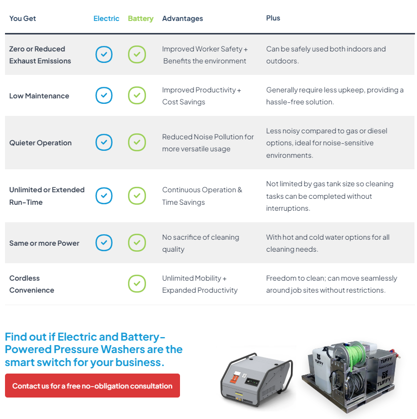Equipment that reduces or eliminates emissions has been front and center across many industries, and is driving the change to electric and battery-powered industrial equipment. But the misconceptions about the performance about using these technologies are holding many companies back. Here’s what you need to know about these eco-friendly options when it comes to industrial cleaning pressure washer equipment.