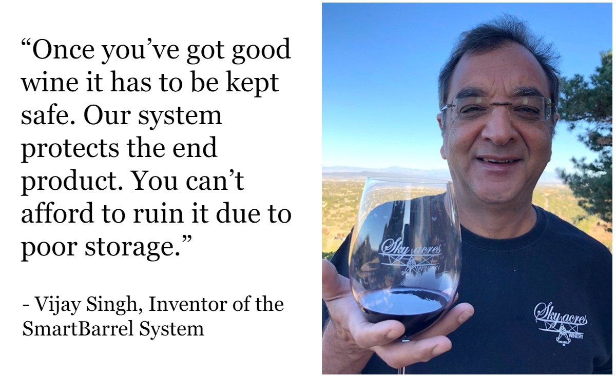 Upgrading your Variable Capacity tank to a SmartBarrel provides an effective, economical, and reliable solution for the safe storage of wine during racking, aging, and bulk. This technology was developed over years of experimentation based on Dr Vijay Singh’s unsurpassed knowledge of flexible pharmaceutical processing. The key component of the SmartBarrel is the patented diptube. The wine is stored in single-use liners that have extremely low oxygen permeability. The contact materials have been used for bag-in-box systems for years and are known not to impart odors or other negative effects.