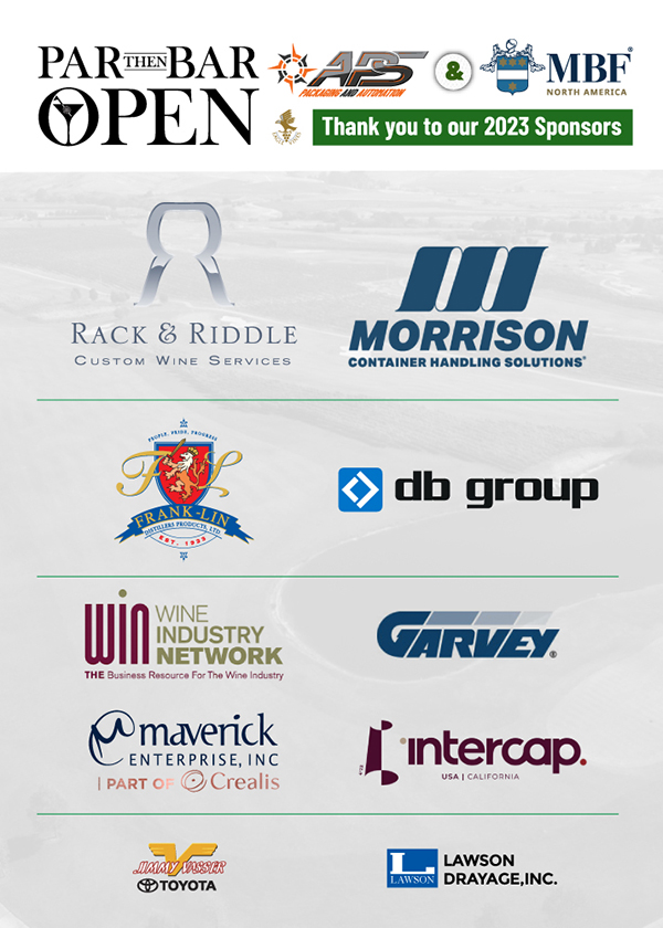 Thank you to all the sponsors of this event: Rack & Riddle Custom Wine Services, Morrison Container Handling Solutions, Frank-lin Distillers Products, DB Group International Freight Forwarding Company, Wine Industry Network, Maverick Enterprise, Garvey Corporation, Lawson Drayage and Intercap USA