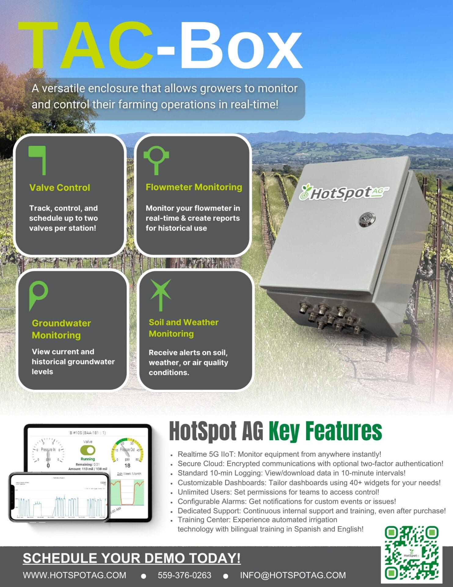 HotSpot’s new TAC-Box saves time, labor and money by scheduling irrigation days, weeks or months in advance. Its real-time 5G IIoT lets growers monitor and operate farm operations remotely via desktop, tablet or mobile device, saving them extra trips into the field. They don’t need to constantly check their devices because they’ll receive alarms and notifications of any issues or custom events — and the TAC-Box can even perform emergency shut-offs when necessary. Even an outage doesn’t shut down communications since telemetry will keep farm operations running smoothly.