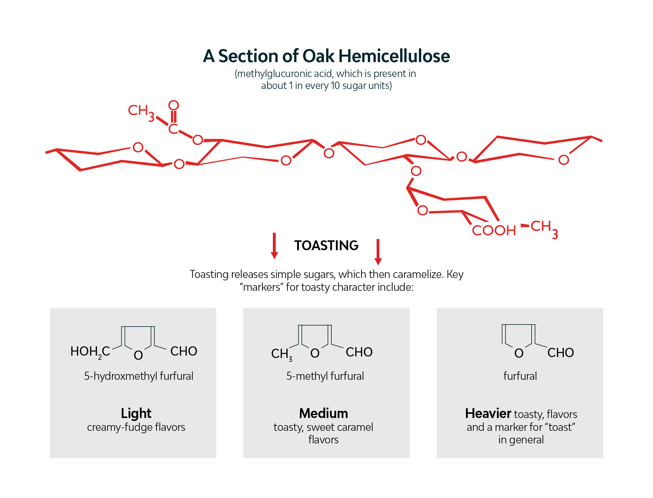 At a certain temperature and heat duration, the hemicellulose in the wood begins to breakdown into simple sugars. These simple sugars then caramelize and become the extractives that provide flavor and body to the wine. For example: