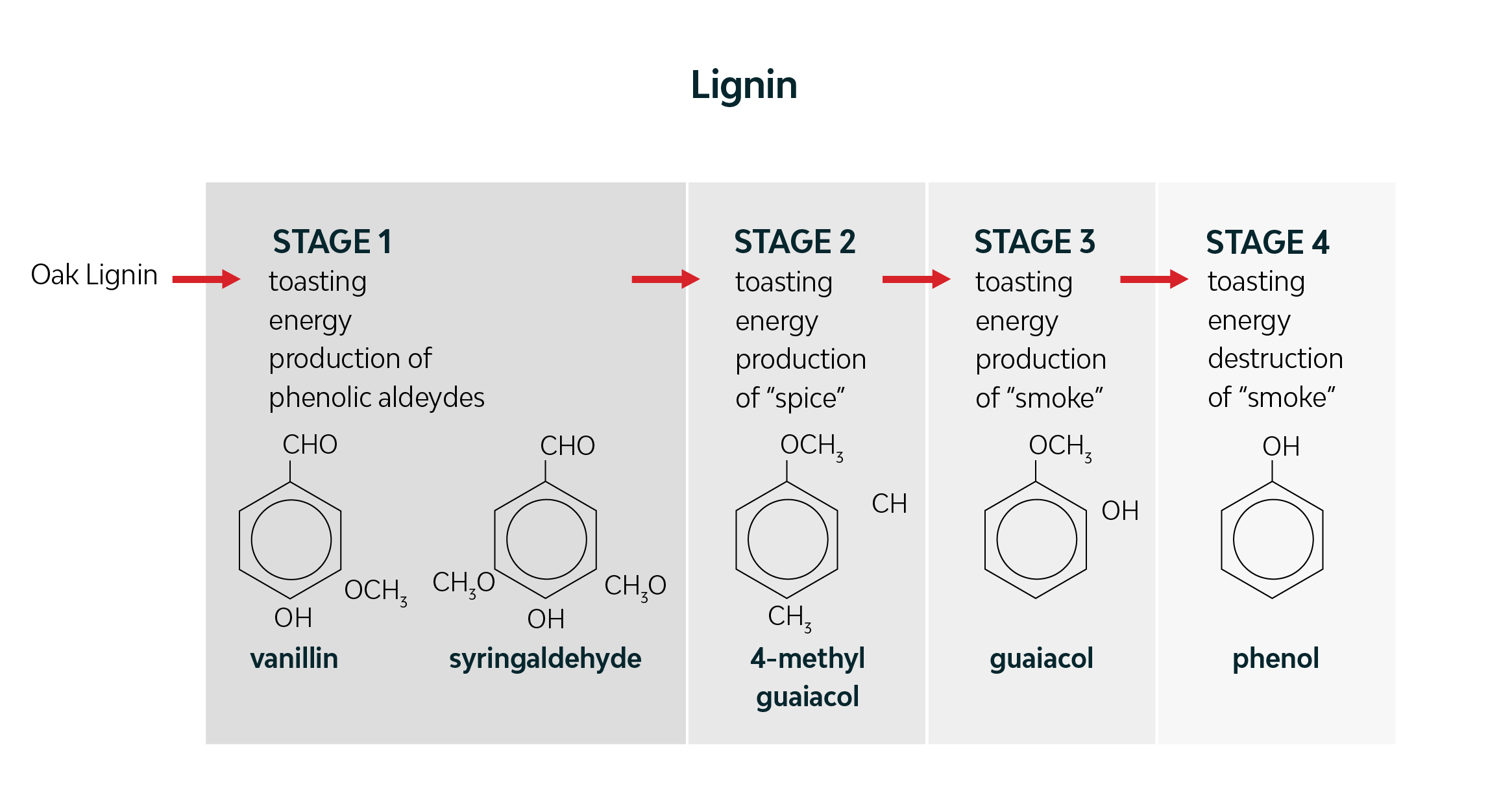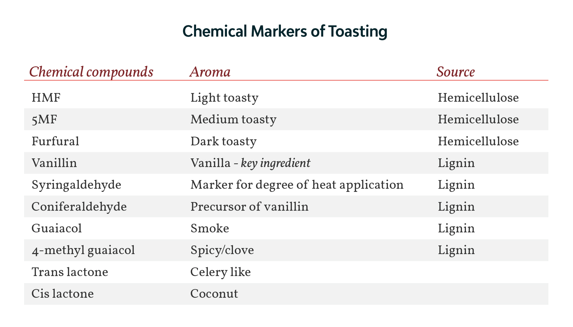 Now let’s take a look at lignin. The lignin in the oak will first breakdown into vanillin and syringaldehyde when toasted – which are desirable characteristics to winemakers. We sometimes like to refer to vanillin as, “catnip for humans”. However, if we apply too much heat, the lignin will breakdown further and create undesirable compounds like guaiacol (which can have a smoky character) or other volatile phenols. It is a delicate balance.