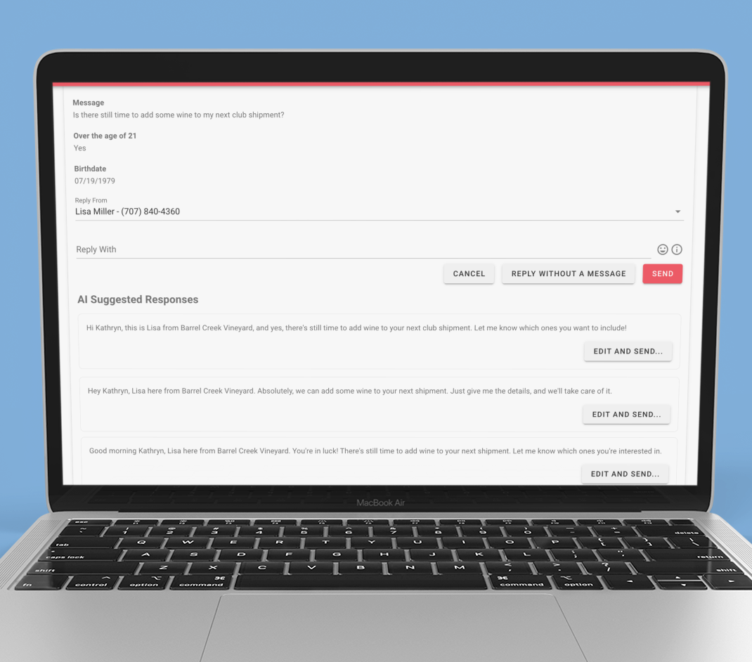 Now when you reply to a webchat request, RedChirp will automatically display 5 AI-generated idealized responses. Compose your own unique response with the benefit of these helpful examples in front of you, select any AI-generated response to send as it is, or select an AI-generated response as a starting point that you edit before sending.