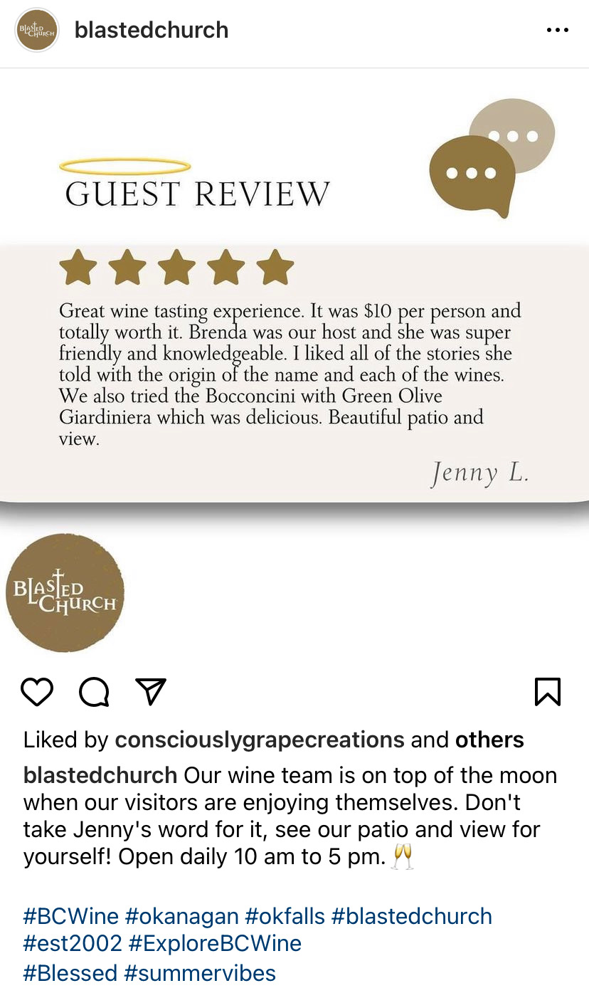 Blasted Church Vineyards sharing a guest review in a social media post, garnering brand advocacy and loyalty