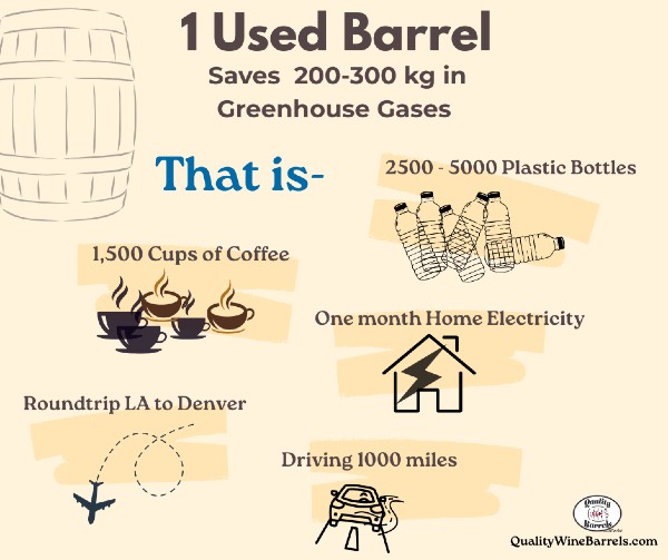 It is estimated that if only 10% of American wineries bought 12 used barrels per year it would amount to taking 600 – 1,100 cars off the road for a whole year.