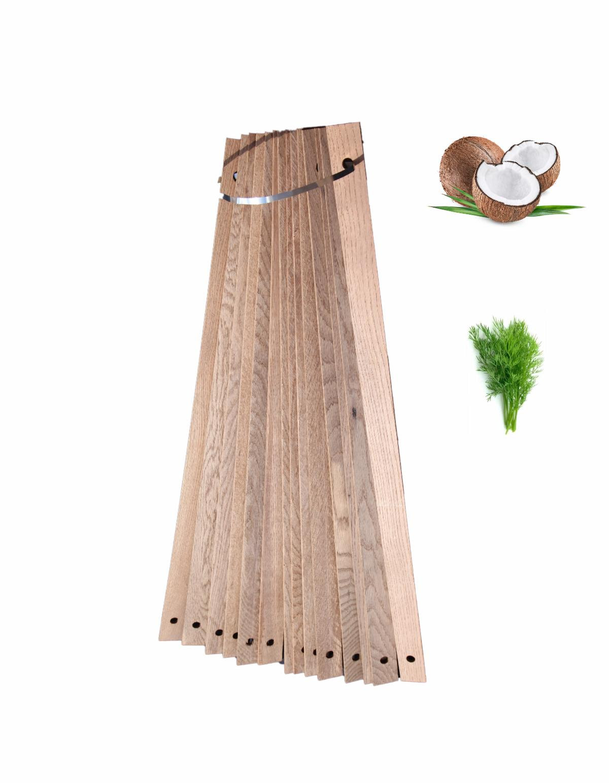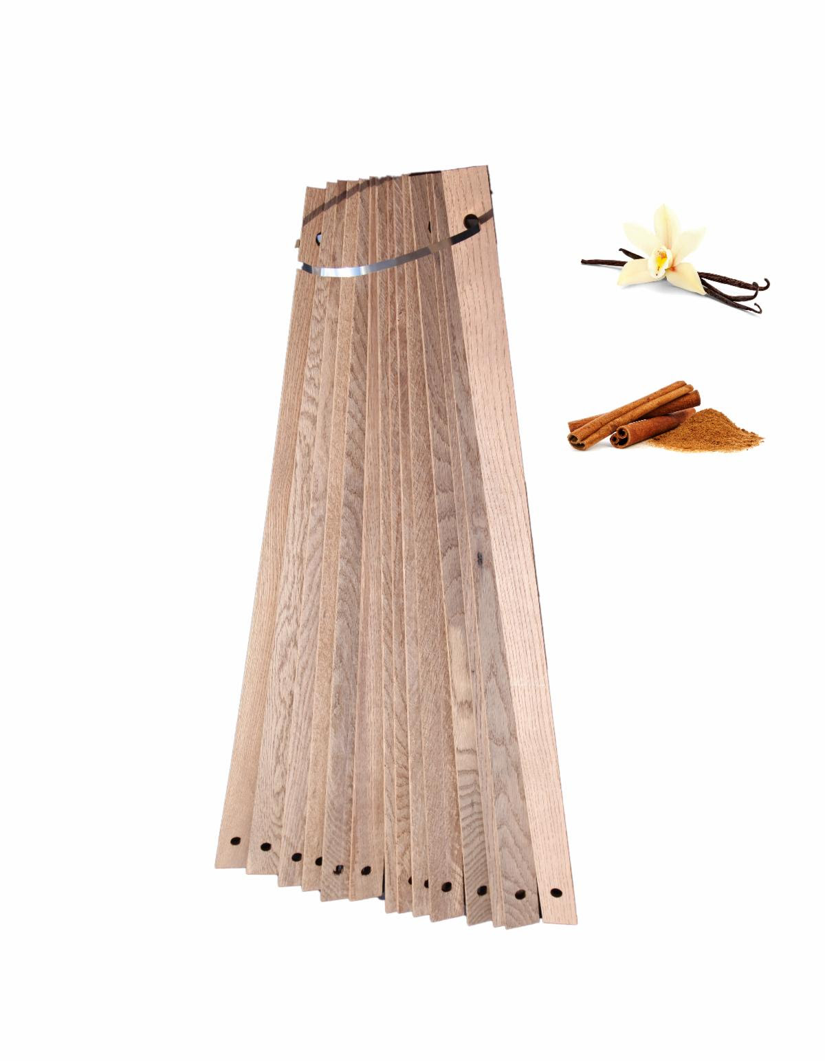 Each stave bundle pack is tied together with a stainless steel strap. Each bundle has the same level of oak to wine contact as compared to using a new 59 gallon barrel. The number of bundles used is a function of tank size and the percentage of new barrel equivalent the winemaker desires. As the staves absorb the wine, they sink into the tank over time. Bloom during extraction is normal, mixing prior to sampling is essential.