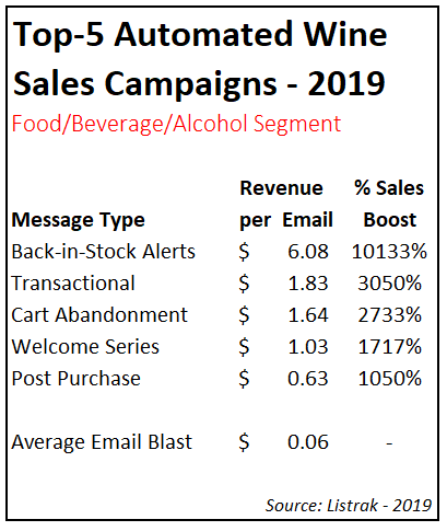For wineries, abandoned cart campaigns outperform other automated sales messages based on revenue generated per name.