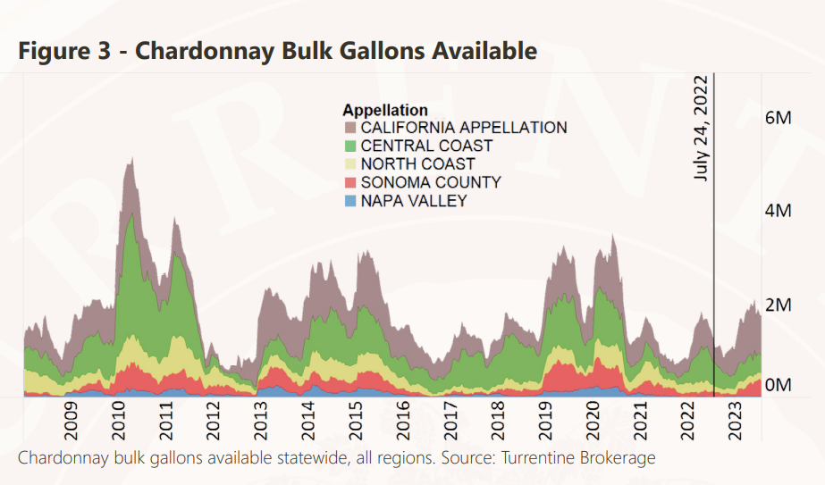 - Volumes of California Appellation Chardonnay have steadily decreased over the last month. Smaller volumes of wine have moved in the $7.00 and under range. Overall, demand remains soft even at asking prices below $4.00 per gallon.