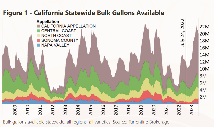 According to our latest analysis, the active listings for bulk wine in the state currently sit at approximately 19.9 million gallons, marking a decline of 2.5 million gallons from its peak in early June. This decrease is equally distributed between the 2021 and 2022 vintages.