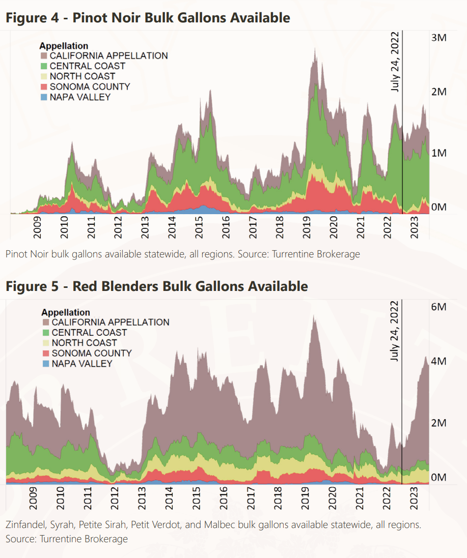 - Demand for Sonoma County and Paso Robles lots have been moderate of late, and asking prices have come down as the year has progressed. Buyers continue to be patient and are looking for smaller volumes. Figure 1 - California Statewide Bulk Gallons Available Bulk gallons available statewide, all regions, all varieties. Source: Turrentine Brokerage Cabernet Sauvignon bulk gallons available statewide, all regions. Source: Turrentine Brokerage Figure 2 - Cabernet Sauvignon Bulk Gallons Available Turrentine Brokerage | The Value of Experience | July, 2023 Page 4 of 8