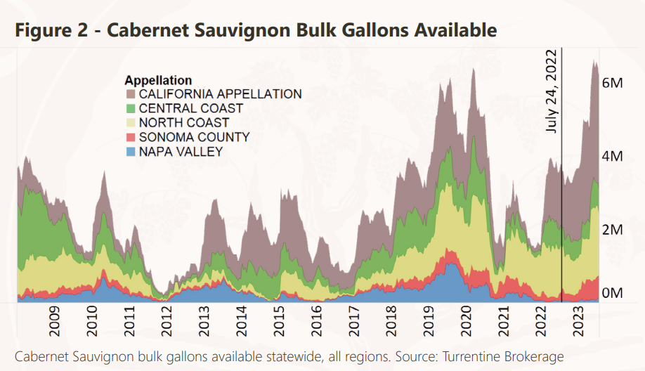 - Lodi and California Appellation Cabernet Sauvignon lots continue to stay on the bulk market. There are now 1.5 million gallons of v22 and a robust 1.4 million gallons of v21 actively for sale. Recent offering prices have been under $4.00 per gallon and that has done little to increase interest in larger volumes from buyers.