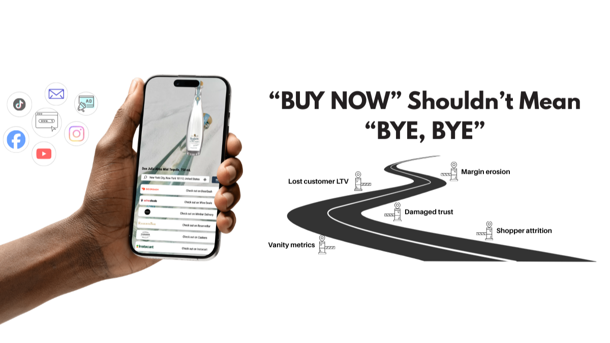 You build your brand and, through every possible channel, excite them to buy your products (your website, marketing, press, social media, or earned media). You pay a carting platform to give you “Buy Now” buttons. A shopper clicks Buy Now, and they get routed to a marketplace, typically Instacart, Uber Eats, DoorDash, ReserveBar, or Flaviar/Caskers, because this is the easiest way for these tools to claim “coverage”.