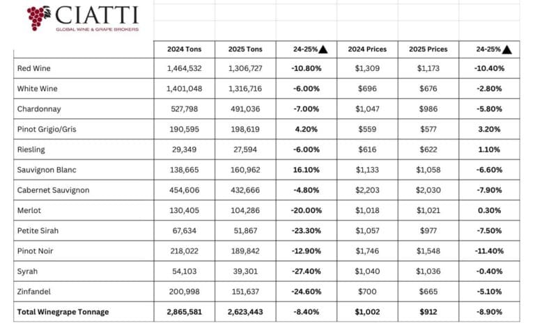 Data released by the California Department of Food and Agriculture shows that the 2025 grape crush totaled approximately 2.6 million tons. That represents a decline of just over 8% from the prior year and marks the smallest crop since the late 1990s.