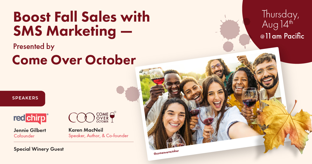 Join wine industry icon Karen MacNeil, RedChirp co-founder Jennie Gilbert, and Laurelle Turner-Clemons from Hess Persson Estates for a practical, idea-packed webinar to help you promote and sell your wine using the Come Over October campaign for creative traction.