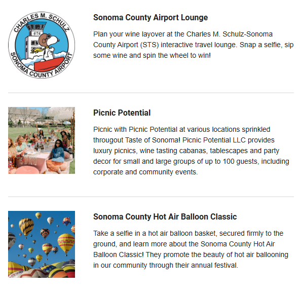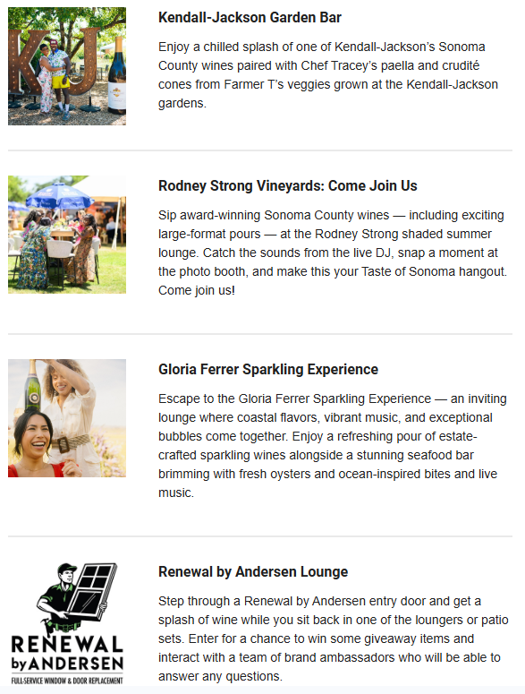 We can’t wait for Taste of Sonoma on June 21, 2025 at Kendall-Jackson Wine Estate & Gardens, produced by Sonoma County Vintners! You’ll taste wines from 100+ wineries, refuel at complimentary food trucks and relax at themed lounges. The lineup will also include a walk-around wine tasting, beer garden, premium wine experiences and more!