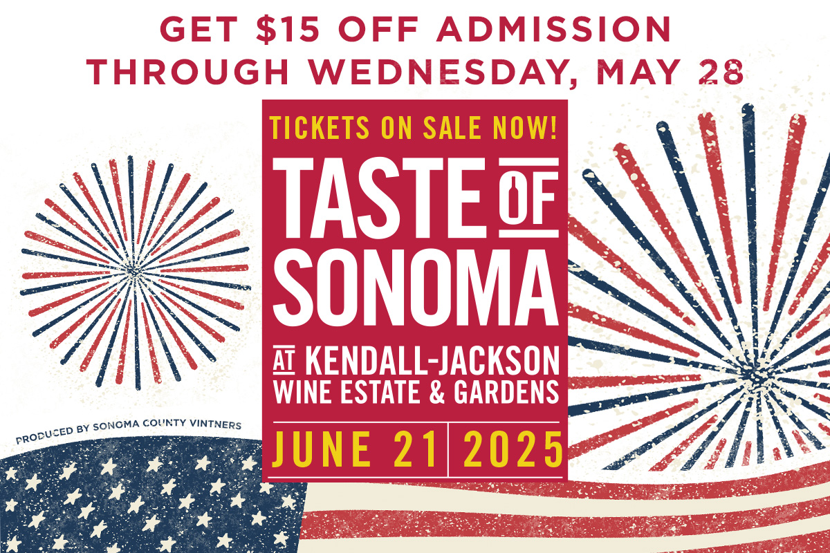 Save $15 on all admission types through May 28 for Taste of Sonoma on June 21 at Kendall-Jackson Wine Estate & Gardens. Produced by Sonoma County Vintners, this beloved annual event has been named as a Best Wine Festival in the USA Today 10Best Readers’ Choice Awards