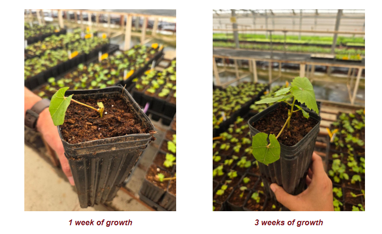 After about one week, new leaves will emerge from the stem. Following an additional two weeks, the vine will develop several new stems and leaves. At this point, the pot can be moved to a standard irrigation system within the greenhouse to continue its growth. After roughly 6-8 weeks, the vine will have grown tall enough for us to then repeat this process with the newly grown leaves to exponentially increase the number of vines produced.