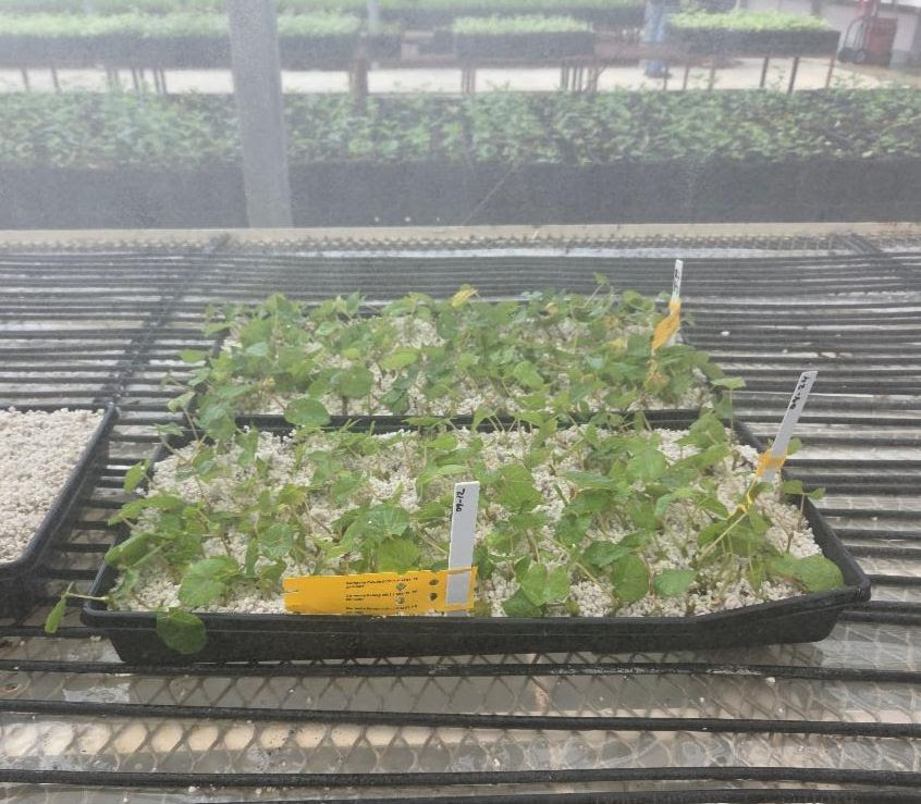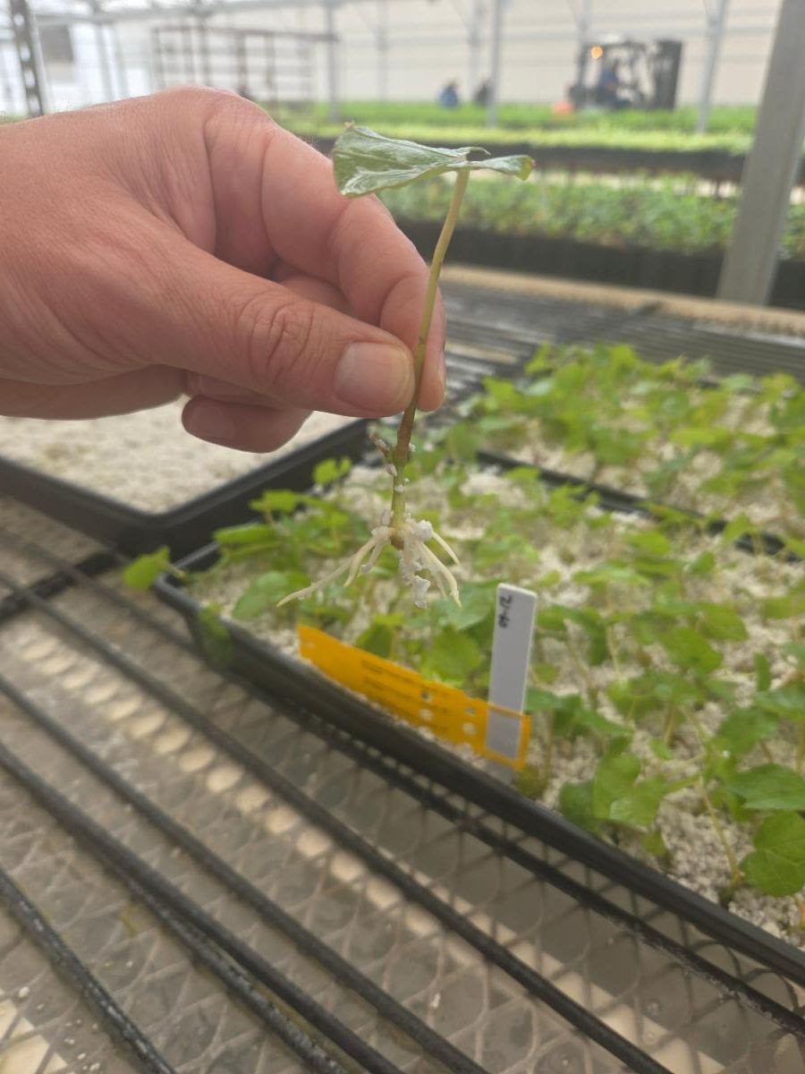 Upon receiving the certified cutting from FPS, the cutting is first dipped in a growth hormone, and the edges of the leaves are trimmed to promote root development. This small cutting is then planted in perlite trays during the initial stage and misted every 5 minutes for approximately 2-3 weeks to maintain a constant state of hydration.
