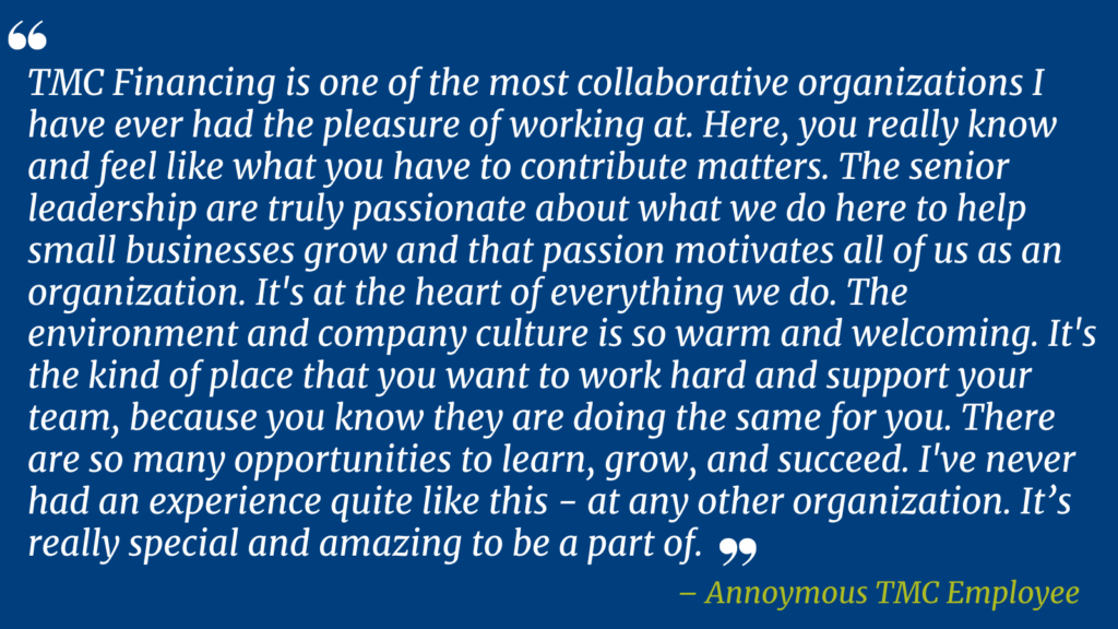 At TMC, our success starts with our people. We believe in building a culture that supports growth, celebrates purpose, and values every team member’s voice. Our employees are united by a passion for small business, a spirit of innovation, and a collaborative, inclusive mindset.