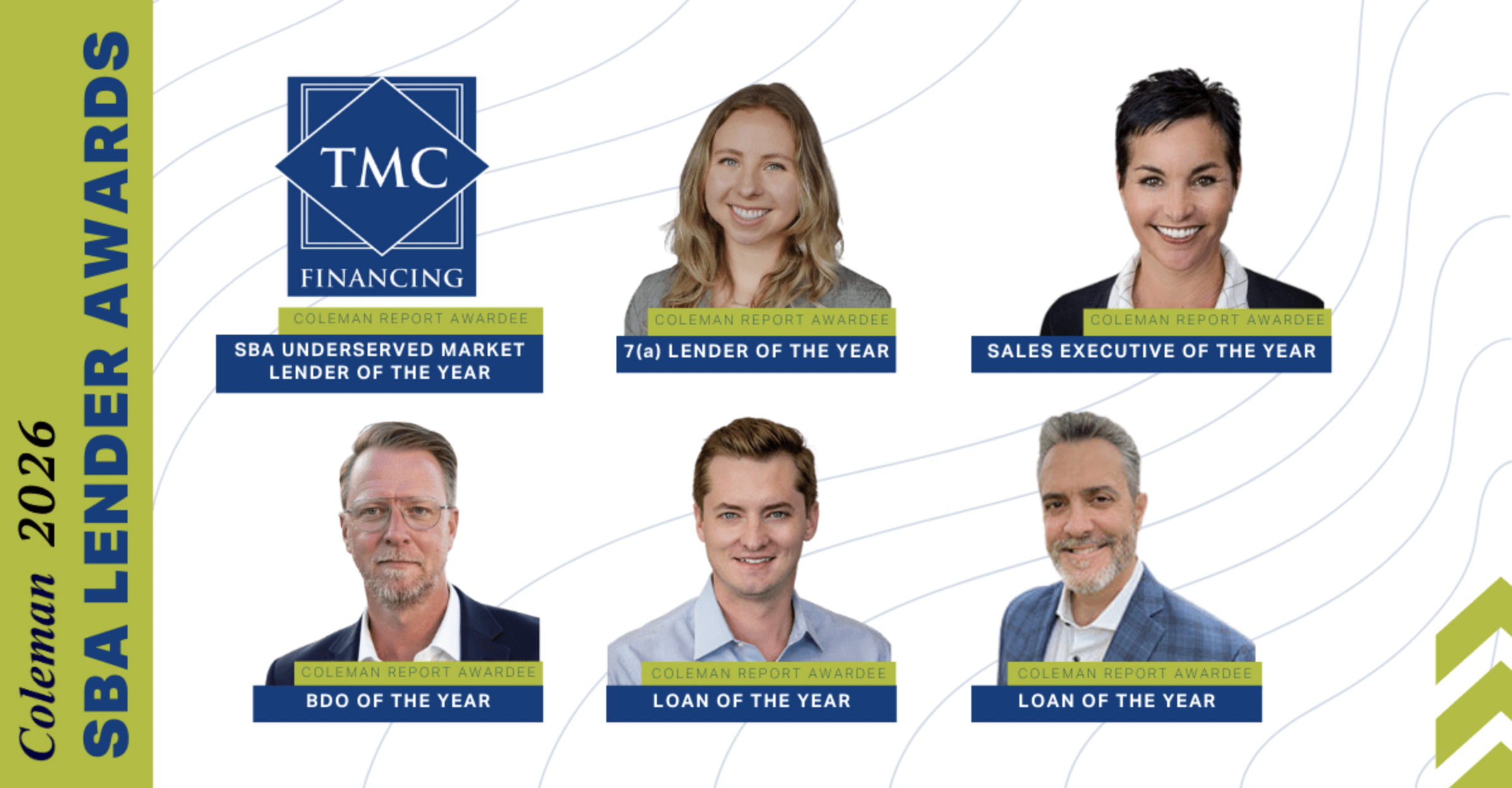 TMC Financing is pleased to announce that several members of its team, along with the company itself, have been honored as part of the 2026 Coleman Report SBA Lender Awards. These recognitions highlight organizations and individuals whose achievements in SBA lending strengthen small business communities and expand access to long‑term, affordable financing.