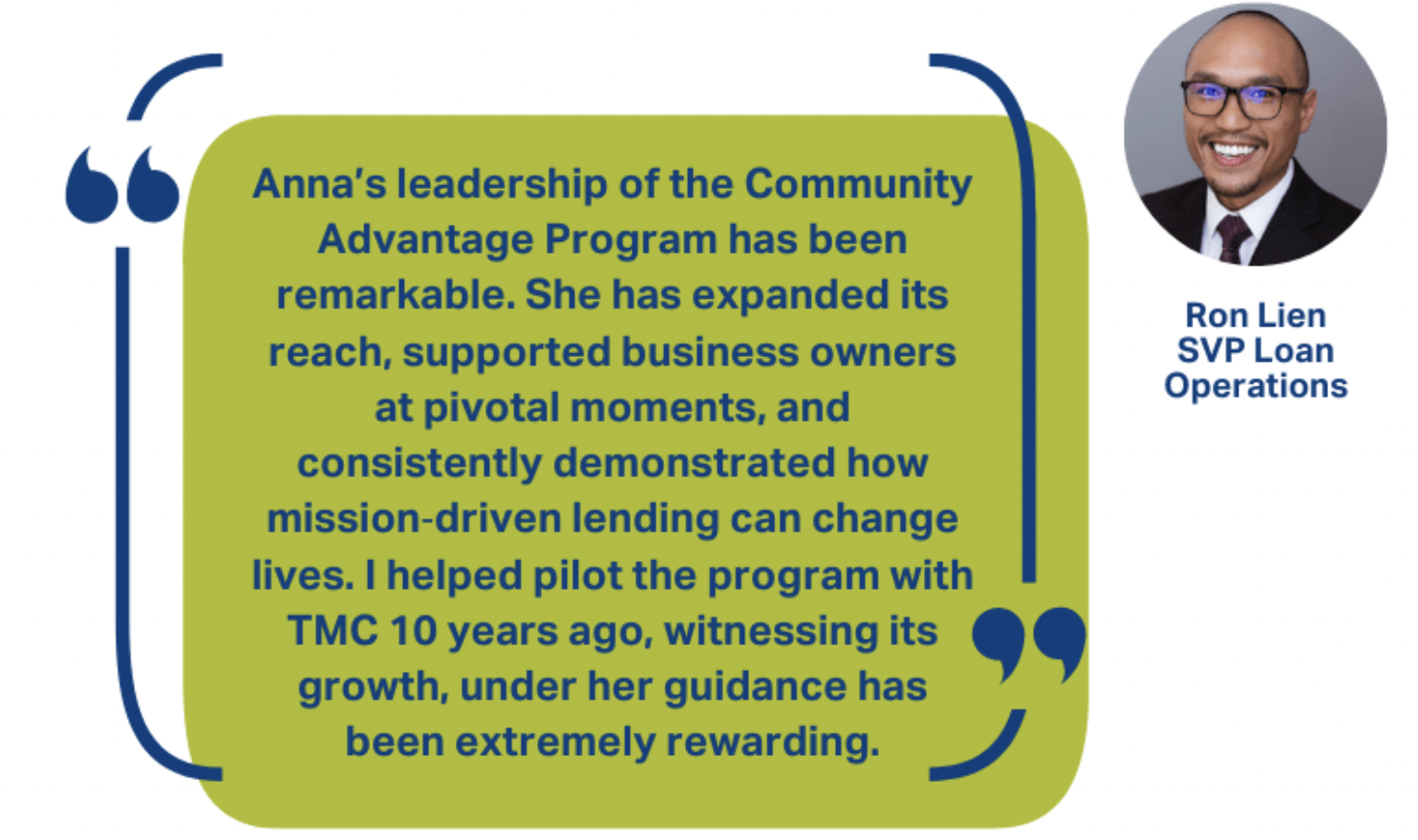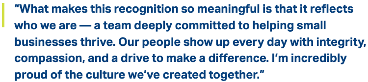 Recognized with the SBA 7(a) Community Advantage Lender of the Year award Vice President of Community Advantage, Anna Lavanger, delivered a strong year of purpose‑driven lending. She funded 35 Community Advantage loans with an average loan size of $206,000. Her portfolio included 10 new businesses, 11 loans in underserved census tracts, one veteran‑owned business, 10 majority women‑owned businesses, and two majority minority‑owned businesses. Seven of her borrowers also advanced into 504 financing, demonstrating the long‑term trajectory she helps create for small business owners. One of her notable successes included helping a start‑up childcare center secure a $250,000 CA loan, enabling the business to open and provide essential family services.