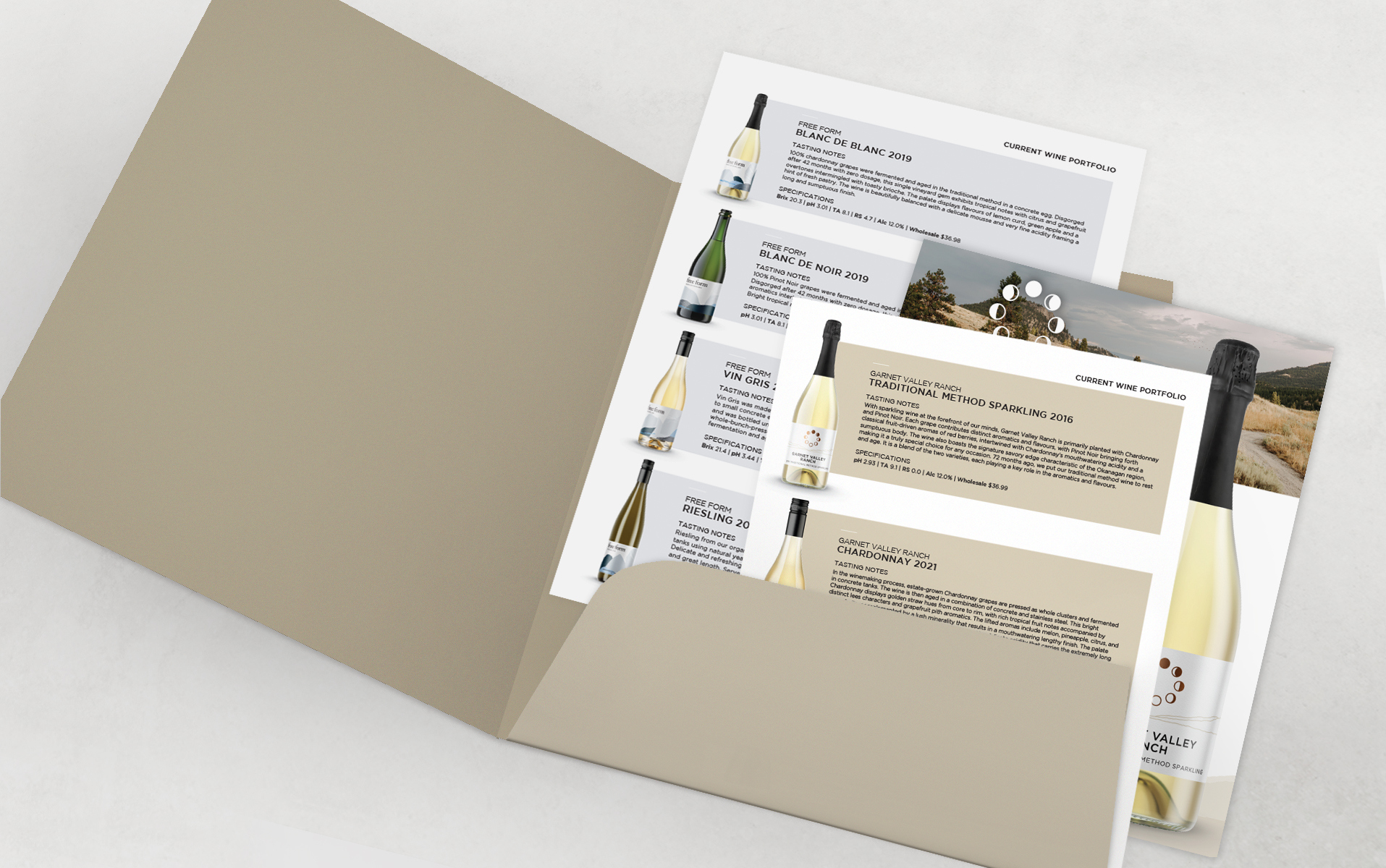 The last step is to create the materials. Portfolio sheets, tech sheets, and sell sheets, shelf talkers, business cards, and tasting cards.