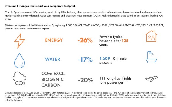 Here is an example of a calculation made with Label Life by UPM Raflatac. The life cycle assessment tool demonstrates the environmental impact of switching from a standard label product to one made with PCR content. Label Life is third party validated by DEKRA, lending additional credibility to the validity of its results.