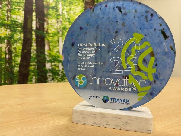 One of those efforts is RafCycle™by UPM Raflatac, a recycling solution that closes a gap in packaging circularity by recycling label-release liners that had previously gone to landfills. Release liner is the silicone-coated label backing that is peeled away from paper or film labels during the dispensing process. RafCycle’s mission is to collect and recycle this label backing after the labels or stickers are adhered to the bottles.