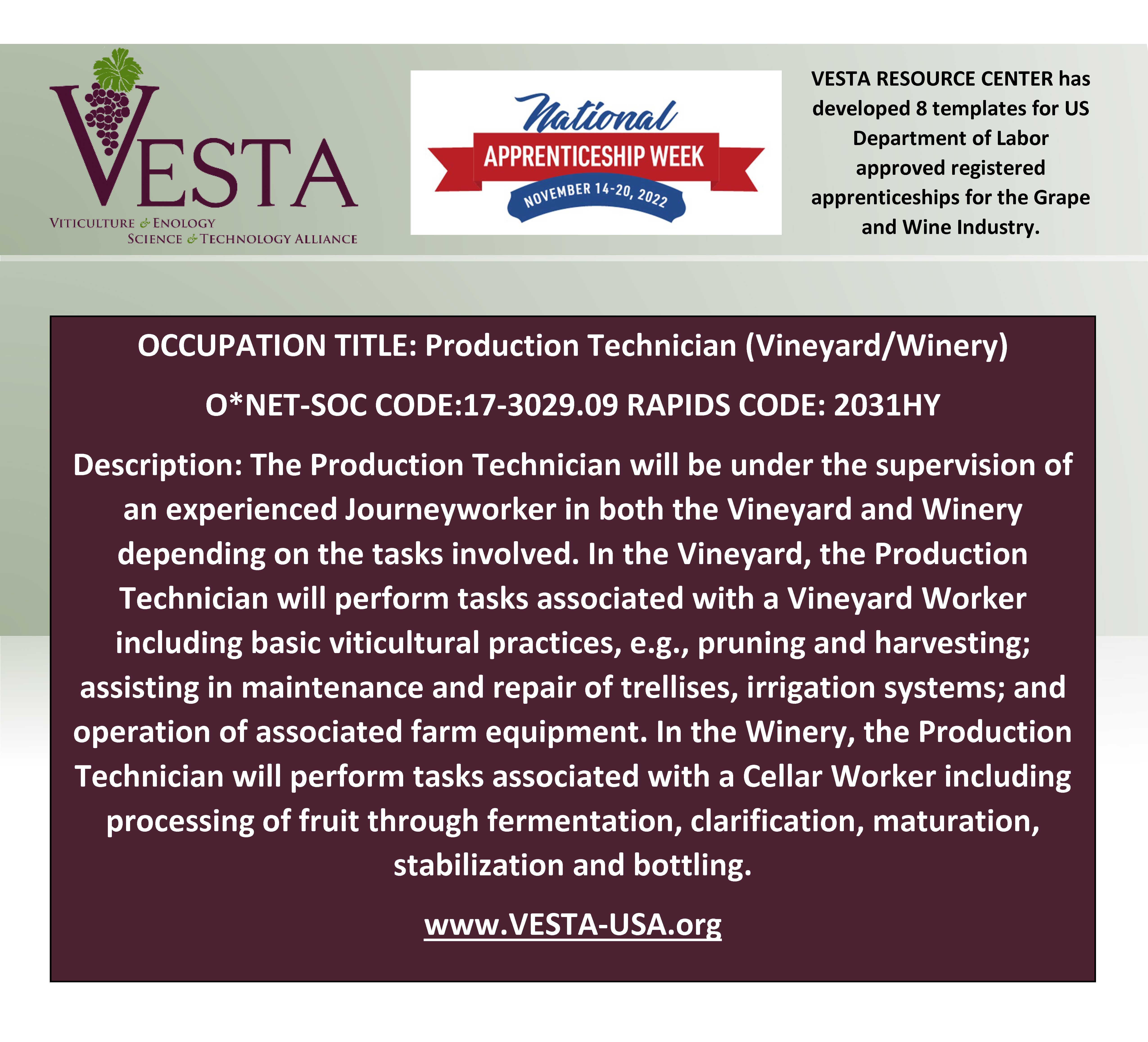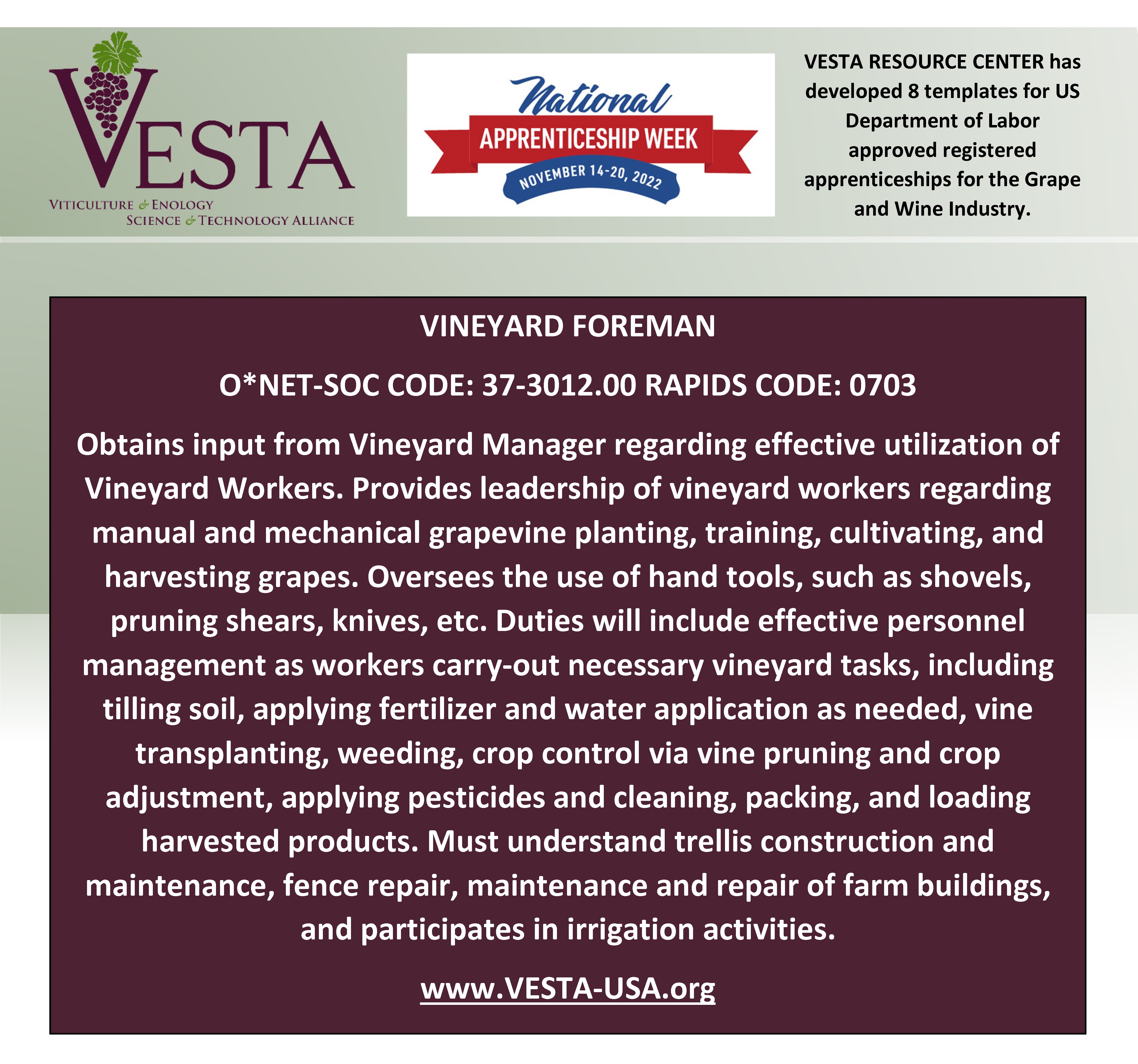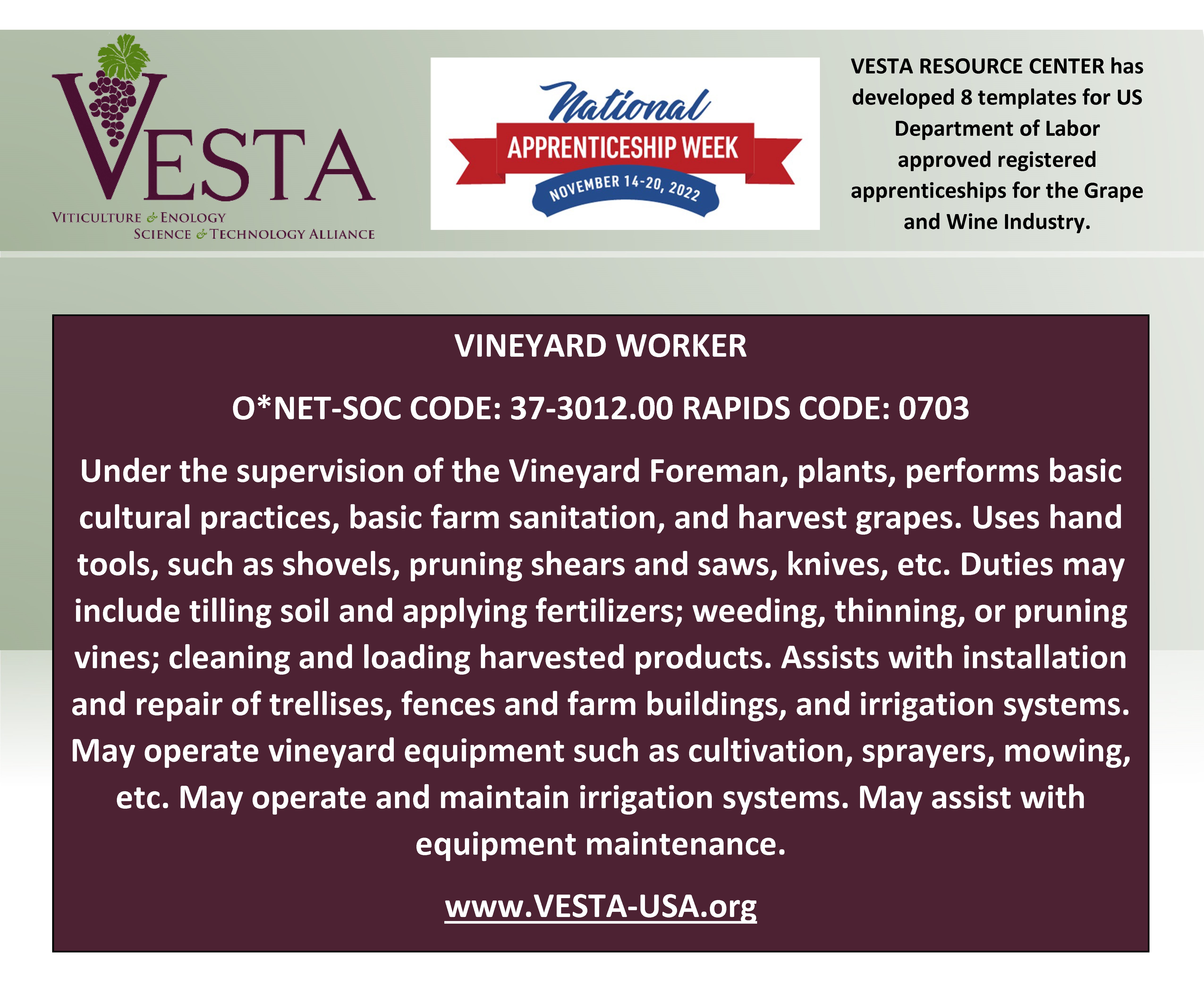Deadline to Register for VIN 212 Winter Viticulture TechnologyNational Apprenticeship Week is November 14-20, 2022. It is also the 85th anniversary of Registered Apprenticeship Act Celebrate with VESTA and the US Department of Labor.